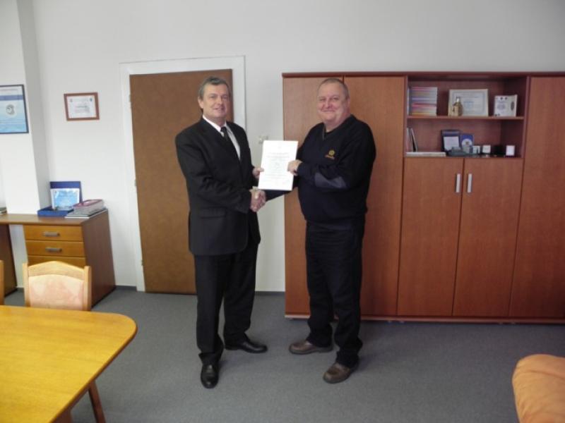 Odovzdávanie osvedčenia spoločnosti ARMA, s.r.o. Dulovce Dňa 1. februára 2017 riaditeľ úradu Ing. Emil KOŠÚT odovzdal Osvedčenie o zhode systému…